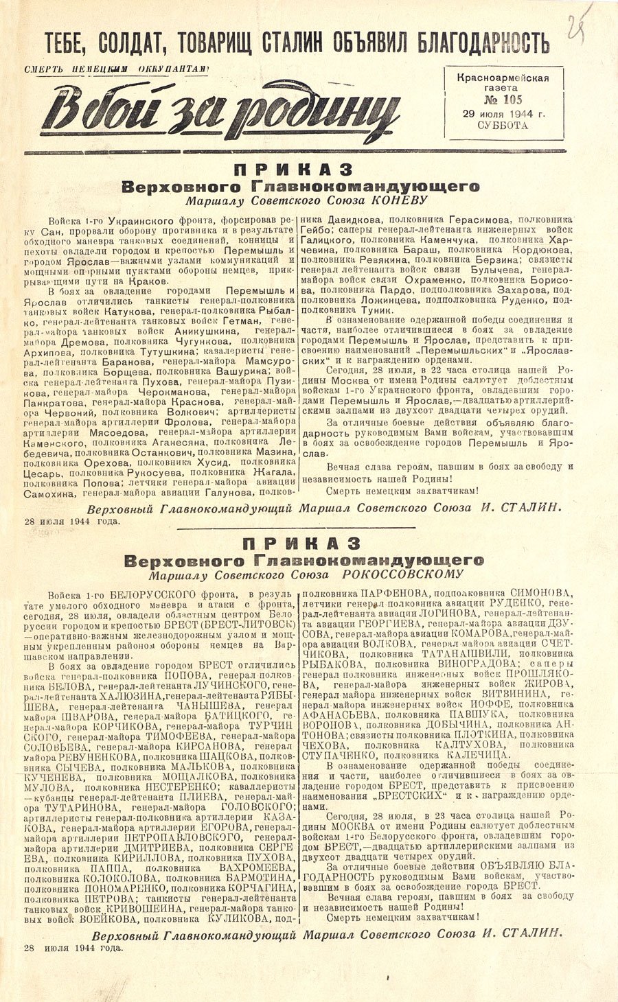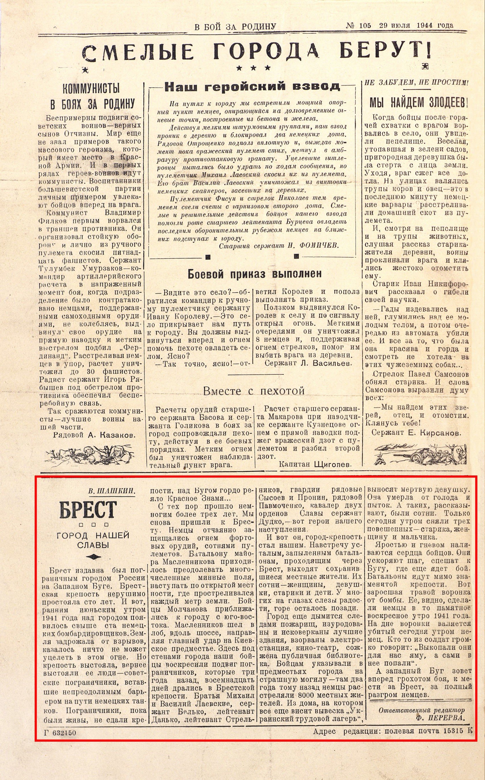 28 июля 1944 года войска 1-го Белорусского фронта в результате умелого обходного маневра и атаки с фронта освободили город и крепость Брест. На следующий день в газете 415-й стрелковой дивизии «В бой за Родину» была напечатана статья «Брест – город нашей славы». Это было одно из первых упоминаний о защитниках гарнизона Брестской крепости.