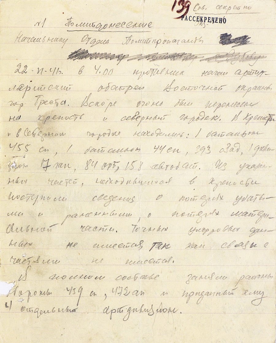 В политдонесении 42-й стрелковой дивизии от 22 июня 1941 года сообщалось о том, что противник начал артобстрел в 4 часа утра и вскоре огонь был перенесен на крепость. Из крепости поступали сведения о потерях убитыми и ранеными.