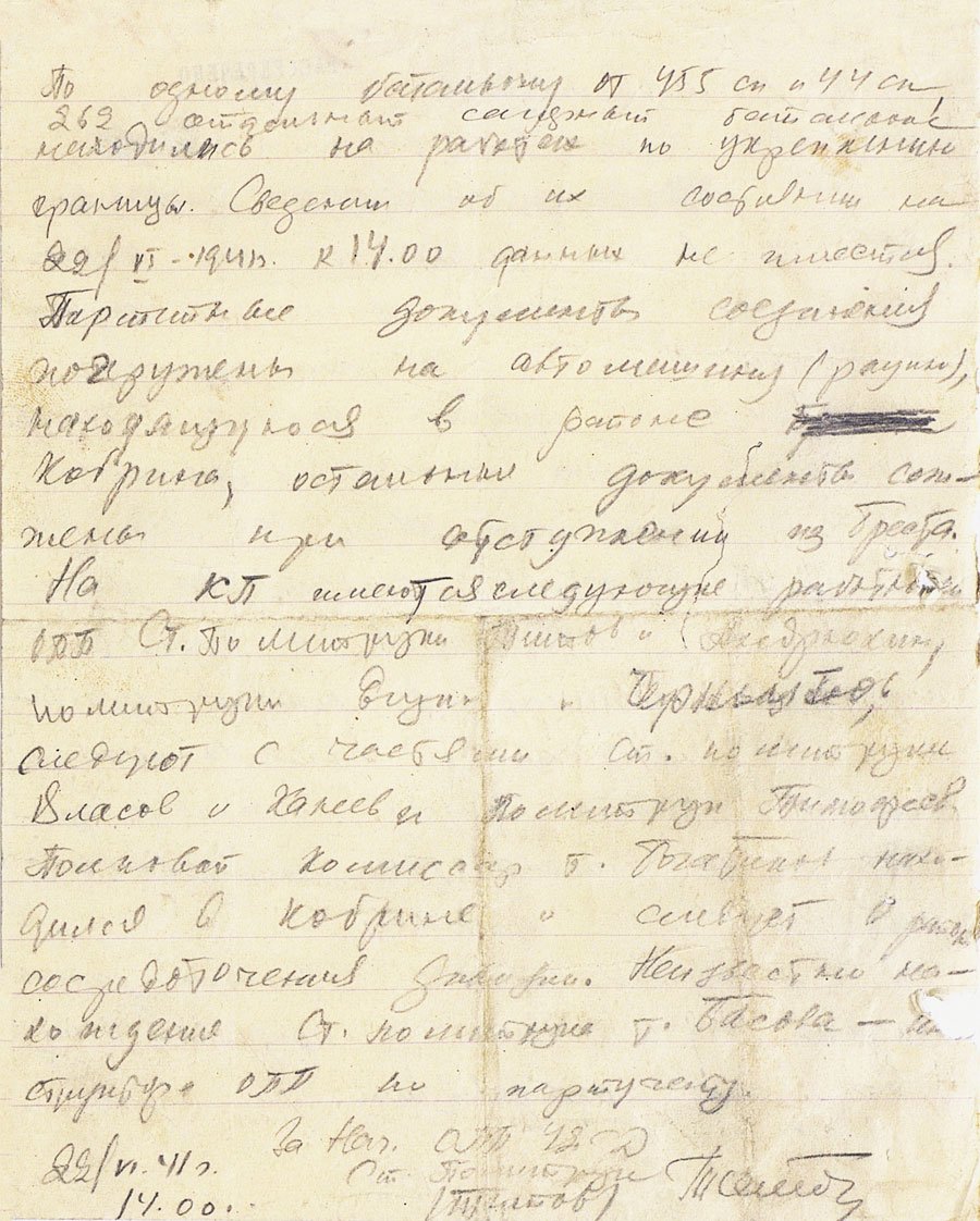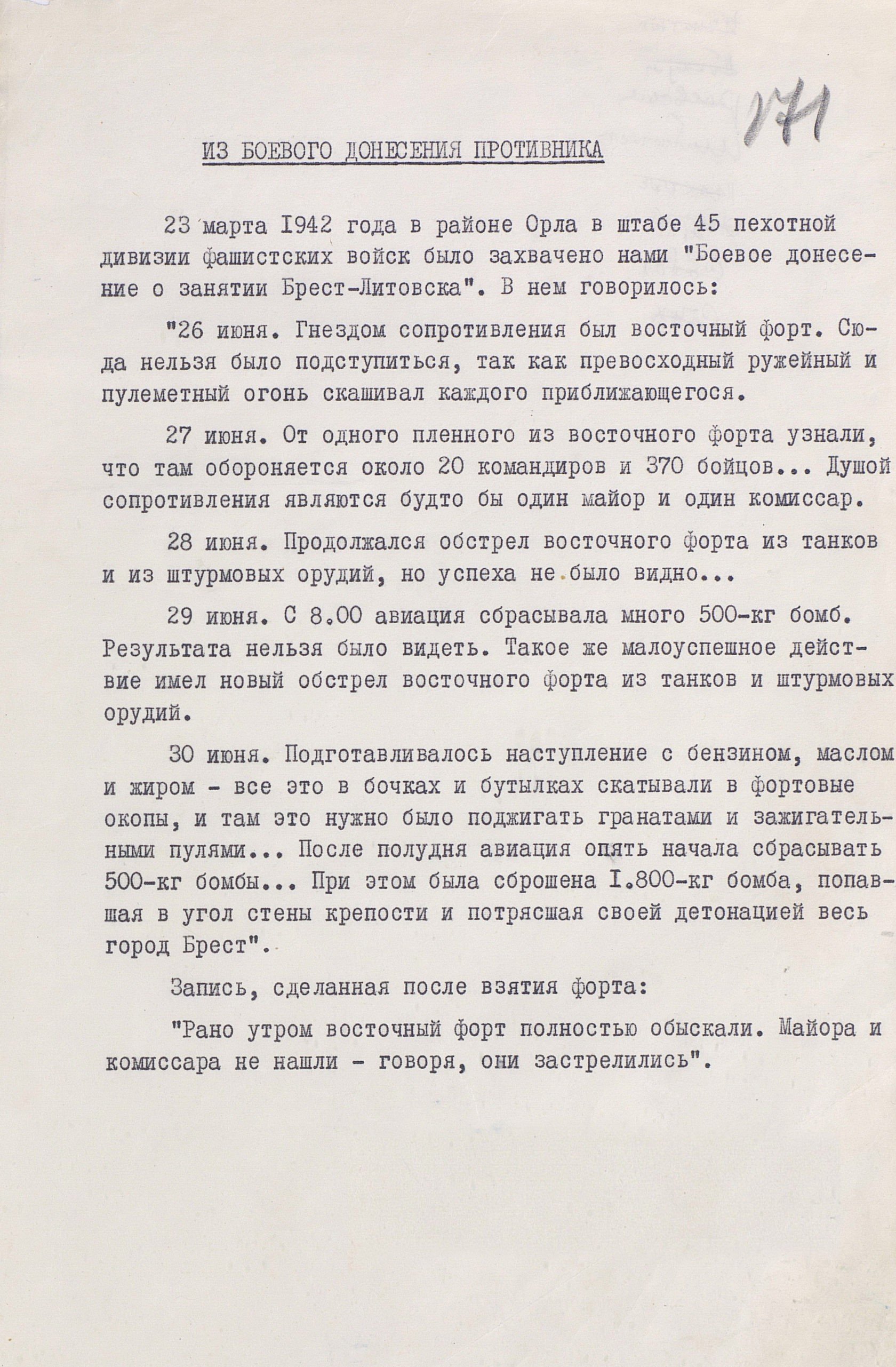23 марта 1942 года в районе Орла в штабе 45 пехотной дивизии фашистских войск было захвачено «Боевое донесение о занятии Брест-Литовска».