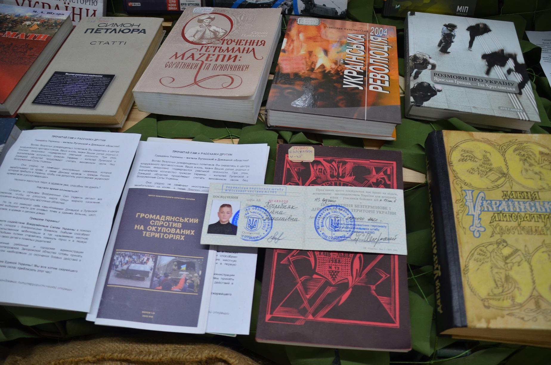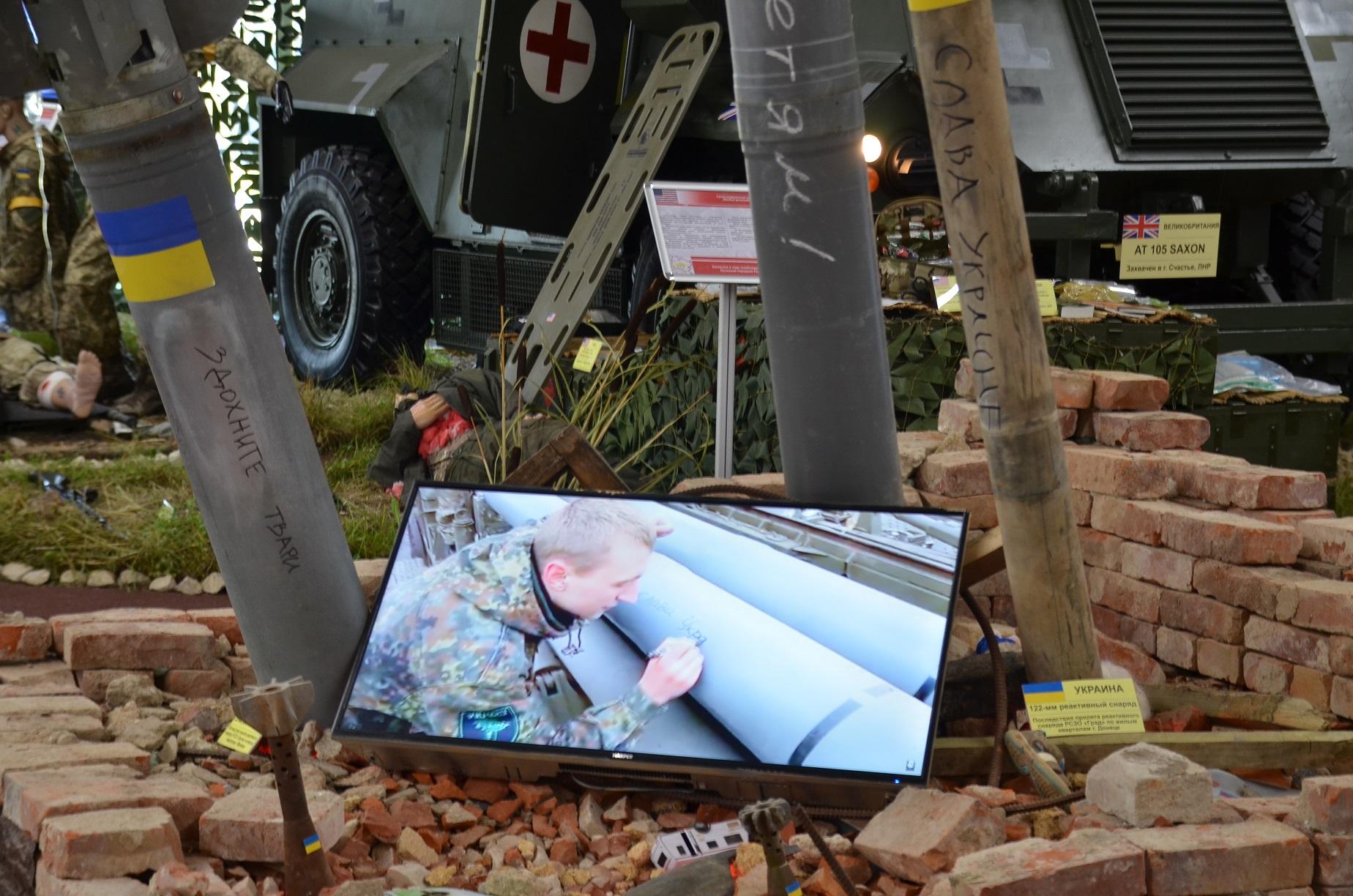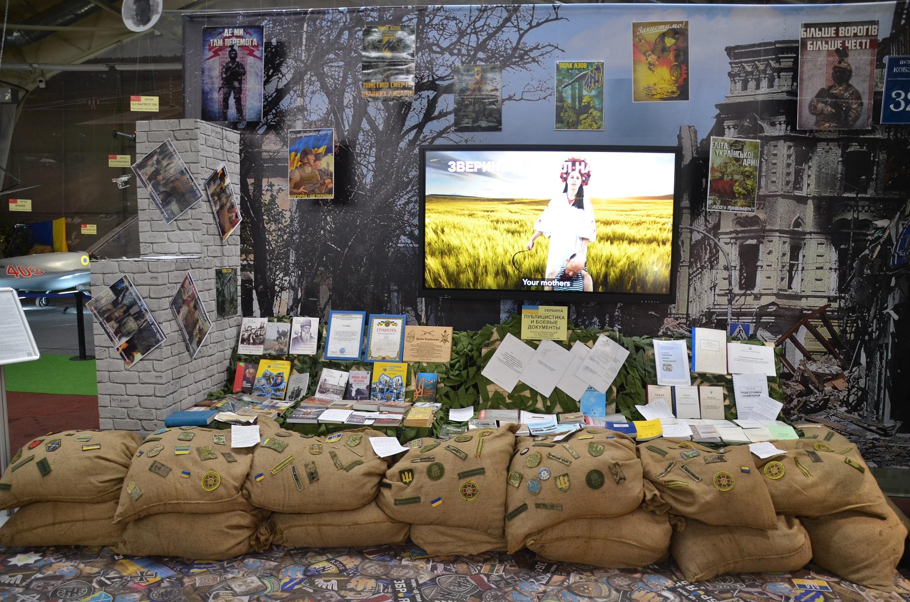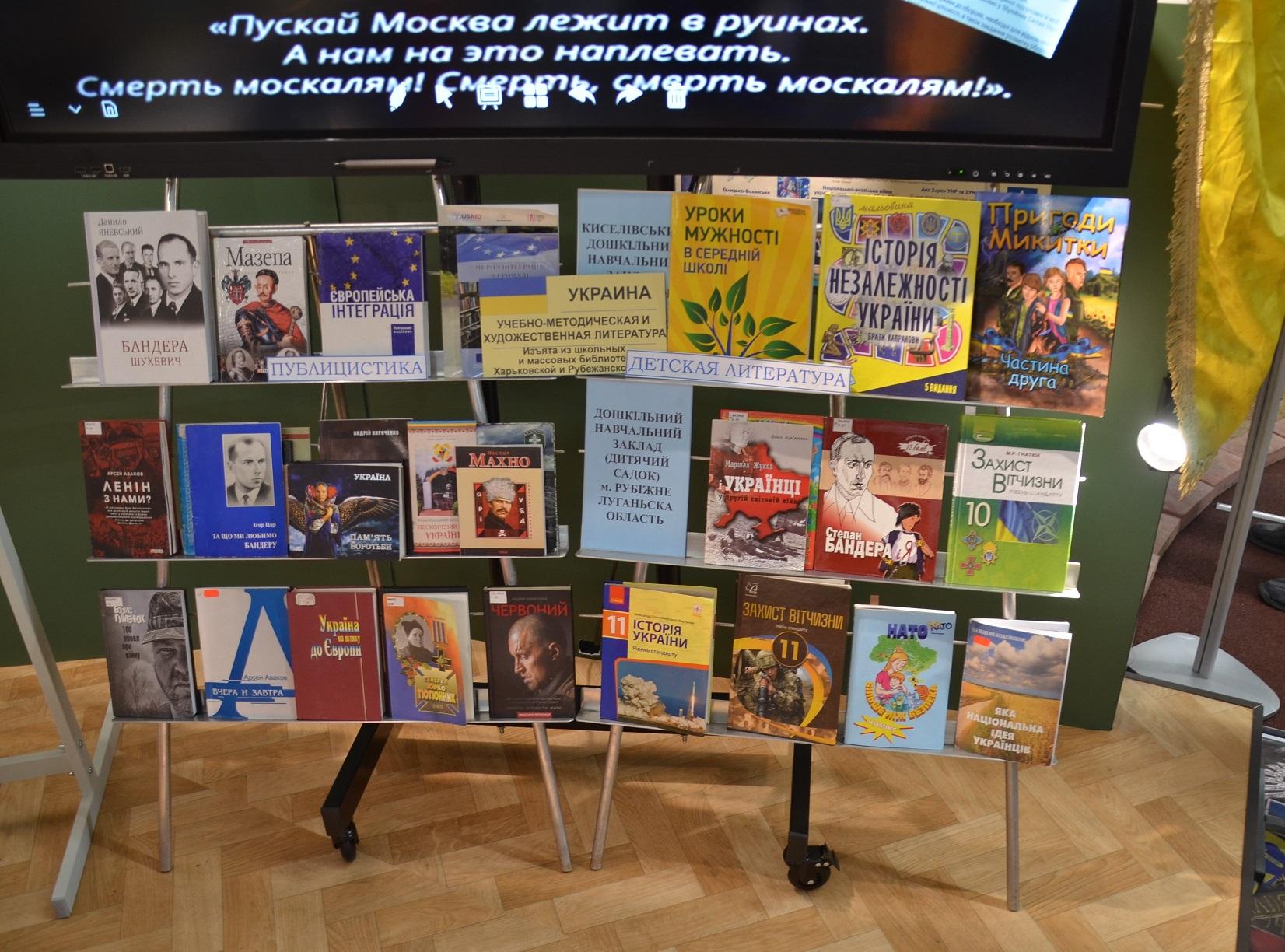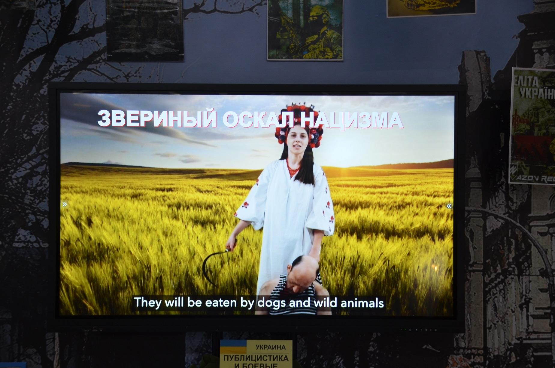 Кроме того на выставке широко представлена украинская нацистская символика, литература, школьные учебники, прививающие украинским детям нацизм, ненависть ко всему русскому и любовь к Бандере и нацистам, украинские нацистские листовки, документы, флаги запрещённых в РФ украинских террористических организаций «Правый сектор» и полка Азов.